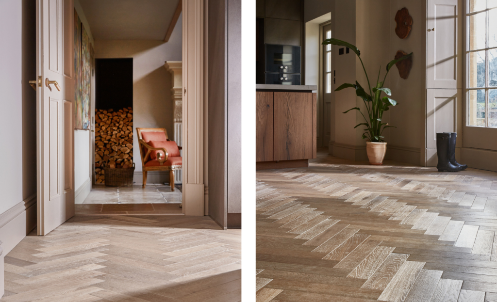Mixing formats not only defines spaces visually but also adds a subtle sense of movement and personality to a home. Combining plank, chevron and herringbone layouts creates depth and rhythm, guiding the eye naturally from one zone to the next. The result is a cohesive yet dynamic environment, where each area feels purposeful while maintaining the overall harmony of an open-plan layout.